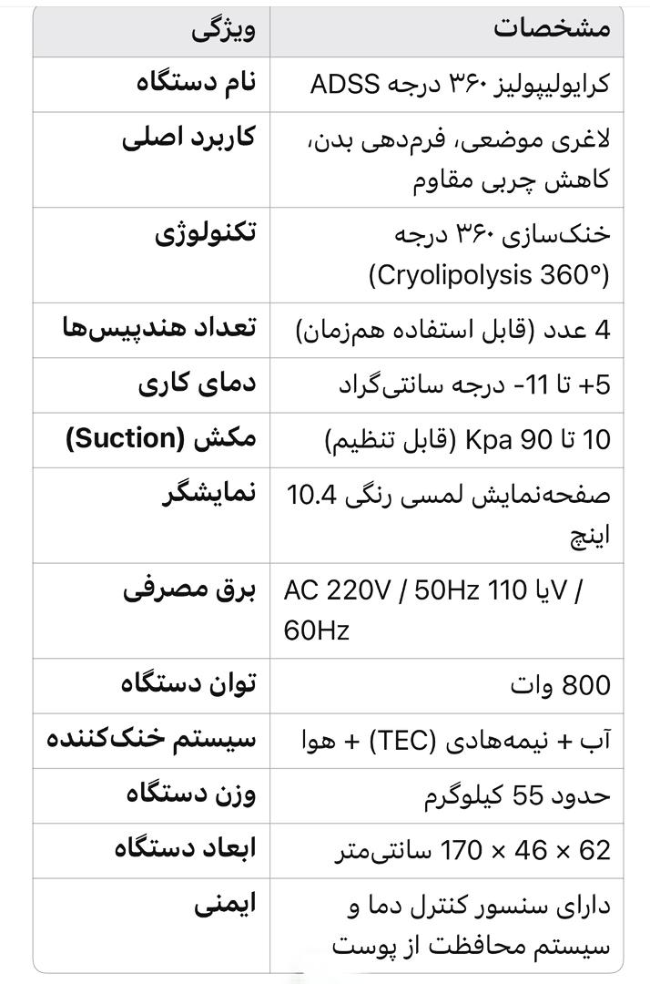 مشخصات فنی دستگاه کرایولیپولیز ۳۶۰ درجه ADSS